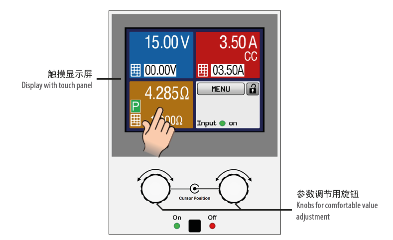 設(shè)定與實(shí)際輸入電壓、電流與功率都清晰顯示于彩屏上。彩色的TFT屏幕為敏感點(diǎn)觸式,用一個(gè)手指就能控制所有功能。